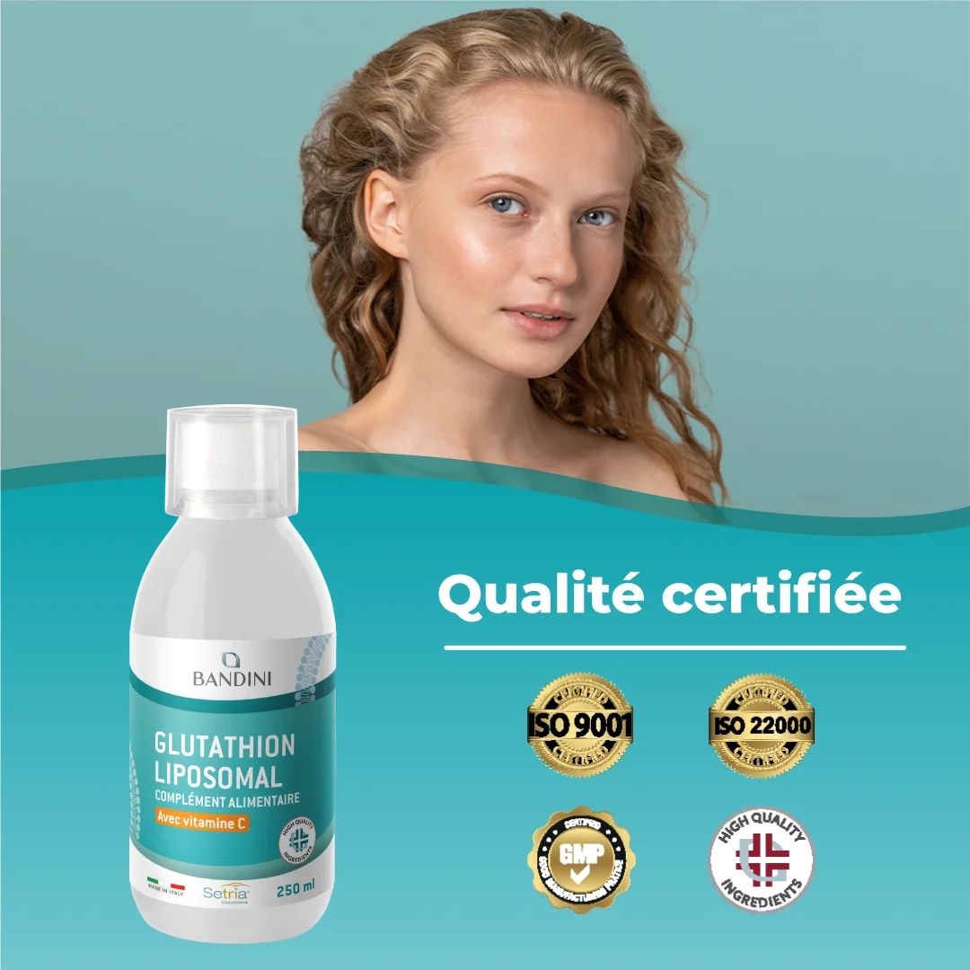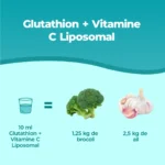Notre formule associe 250 mg de glutathion Setria réduit, pour le soutien du bien-être cellulaire, et 790 mg de vitamine C, qui aide à protéger les cellules du stress oxydatif. Le glutathion est une molécule produite naturellement par l’organisme, mais son taux peut baisser avec le temps. La vitamine C contribue à renforcer l’action du glutathion et soutenir le système immunitaire. Grâce à la technologie liposomale, nous assurons une absorption optimale.