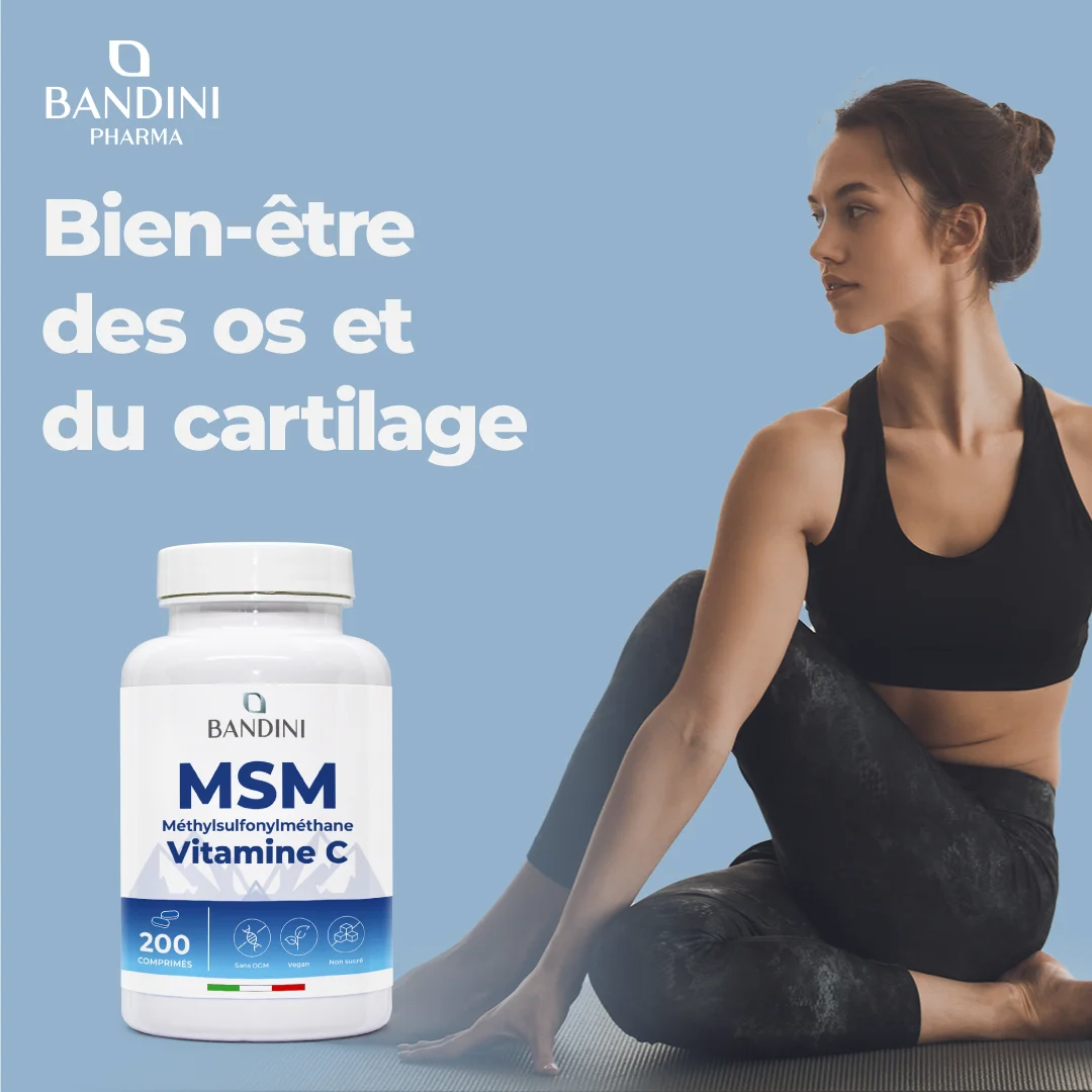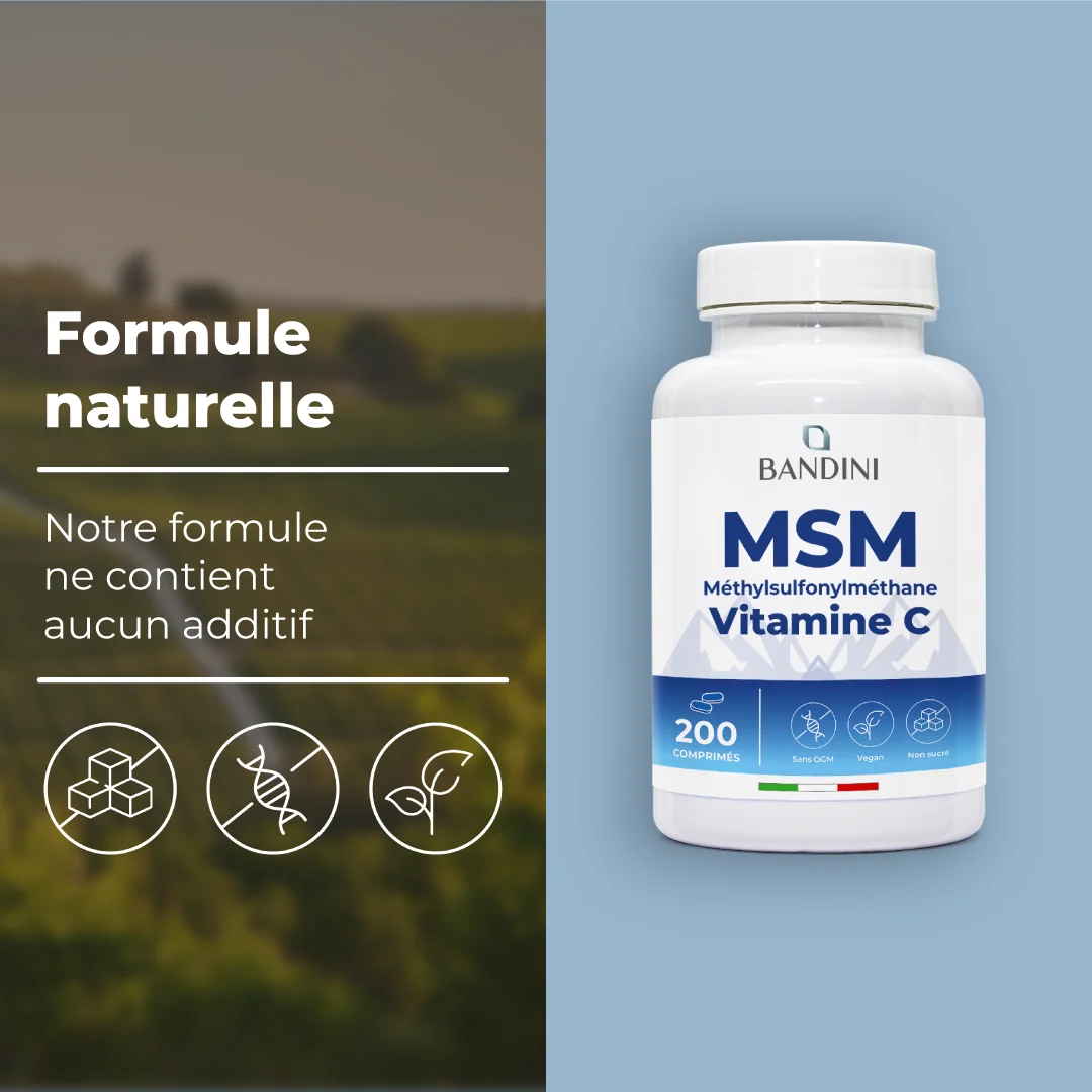 Complément alimentaire contenant du méthylsulfonylméthane et de la vitamine C. Paquet de 200 comprimés.