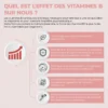 Le B1 contribue à la fonction cardiaque normale et, avec les B2, B6 et B12, contribue au métabolisme énergétique et au fonctionnement du système nerveux. La B2 contribue au maintien de globules rouges normaux et, avec la B6 et la B12, contribue également à la réduction de la fatigue. La B12 intervient dans le processus de division cellulaire et, avec la vitamine B6, contribue au fonctionnement normal du système immunitaire et à la formation des globules rouges.