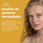 La vitamine D contribue à l’absorption normale/utilisation du calcium et phosphore et au maintien de la fonction musculaire normale. Contribue au maintien d’os normaux et de dents normales. La vitamine D contribue au fonctionnement normal du système immunitaire et intervient dans le processus de division cellulaire.